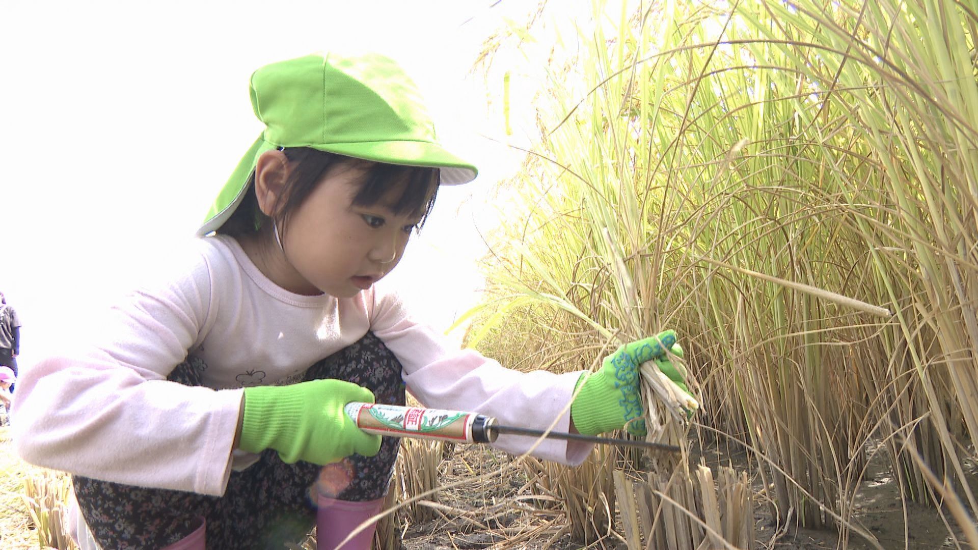 園児たちは農家に手伝ってもらいながら、鎌で一生懸命、稲を刈り取っていました。