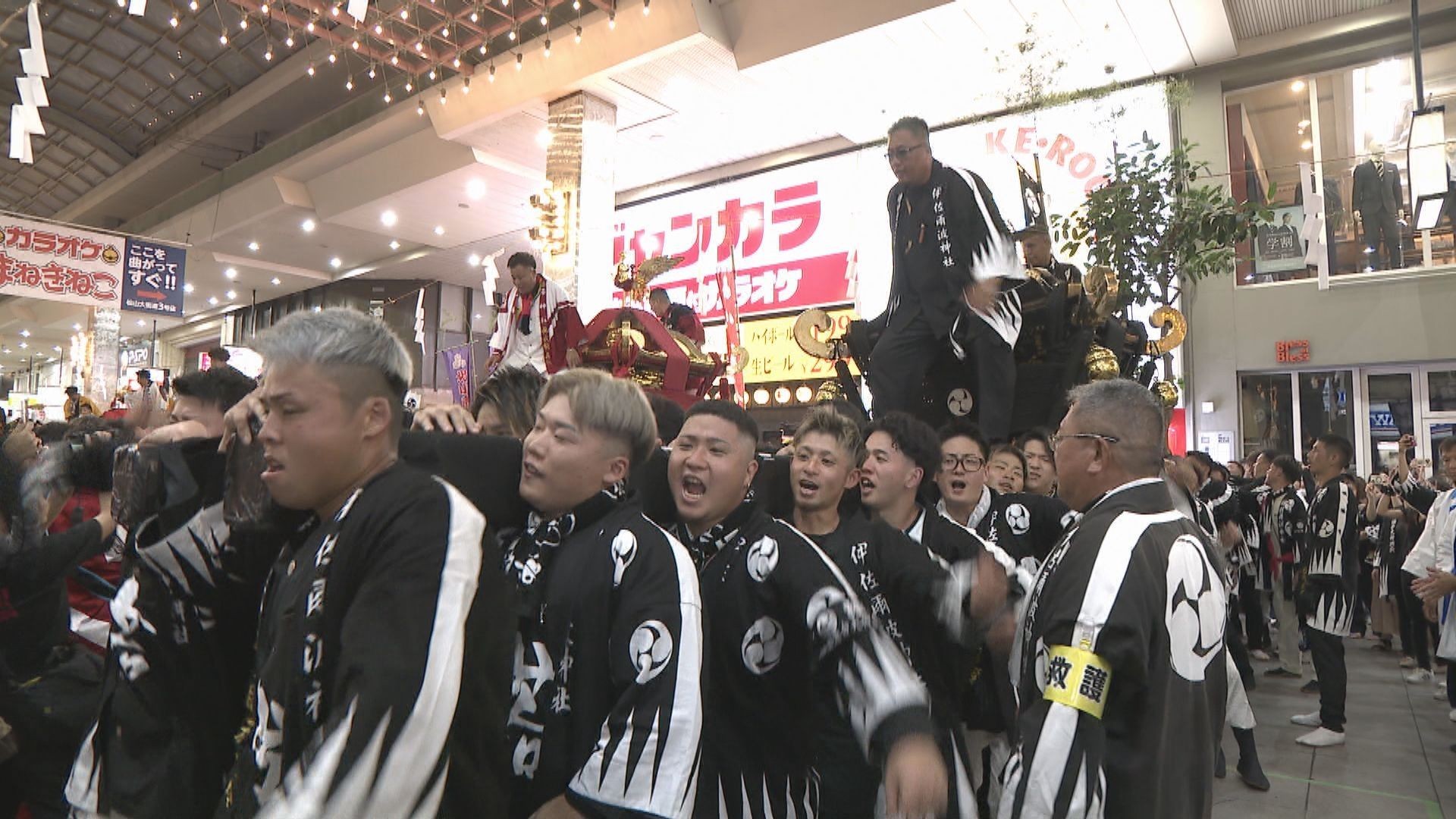 午後5時半ごろ、合わせて13体の神輿が大街道側や銀天街側からそれぞれ出発し、会場となる大街道商店街に集結します。
