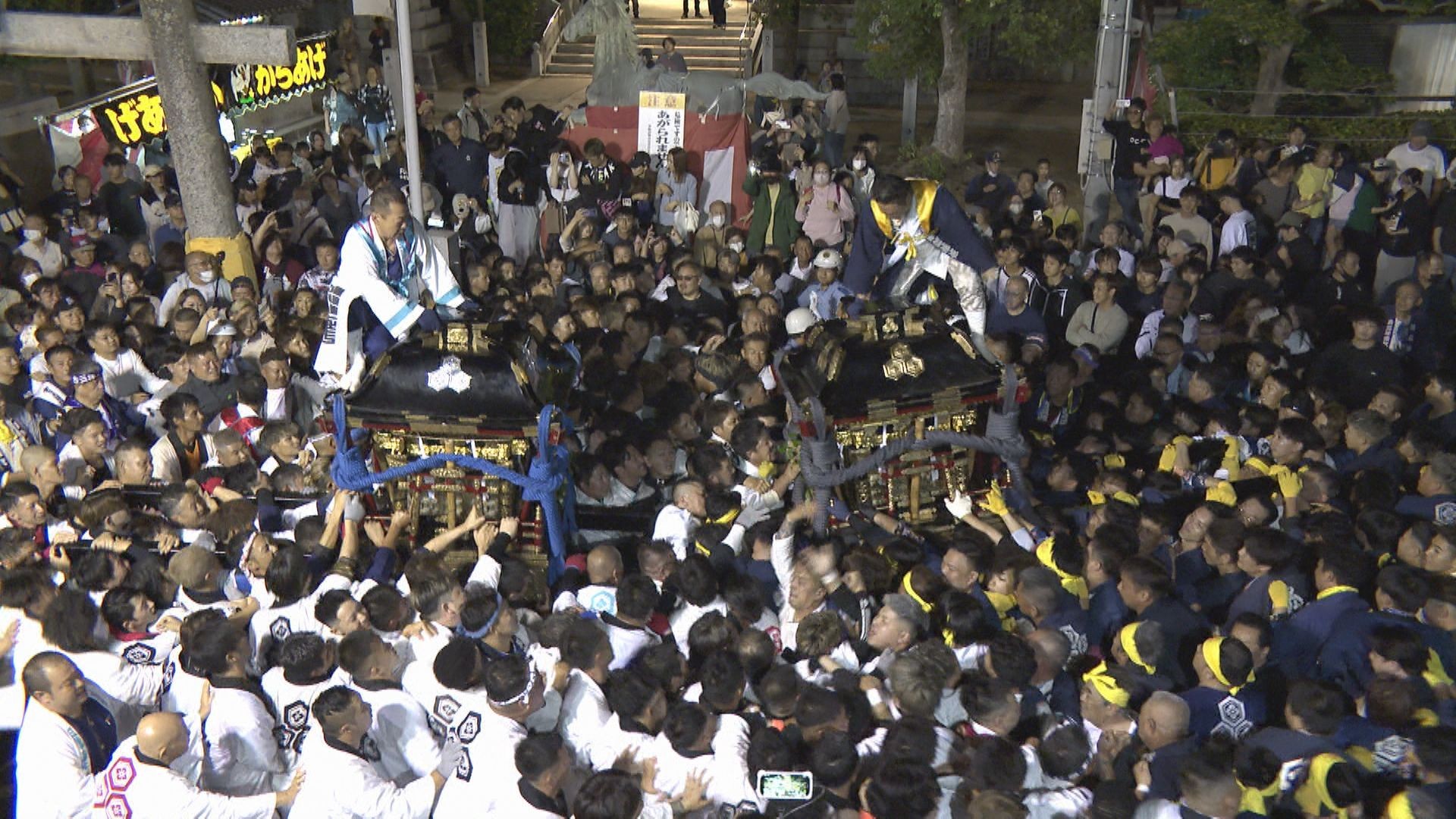 そして4体の神輿を参道まで担ぎ出すと、二手に分かれて神輿どうしをぶつけあう「けんか神輿」と呼ばれる鉢合わせを披露しました。