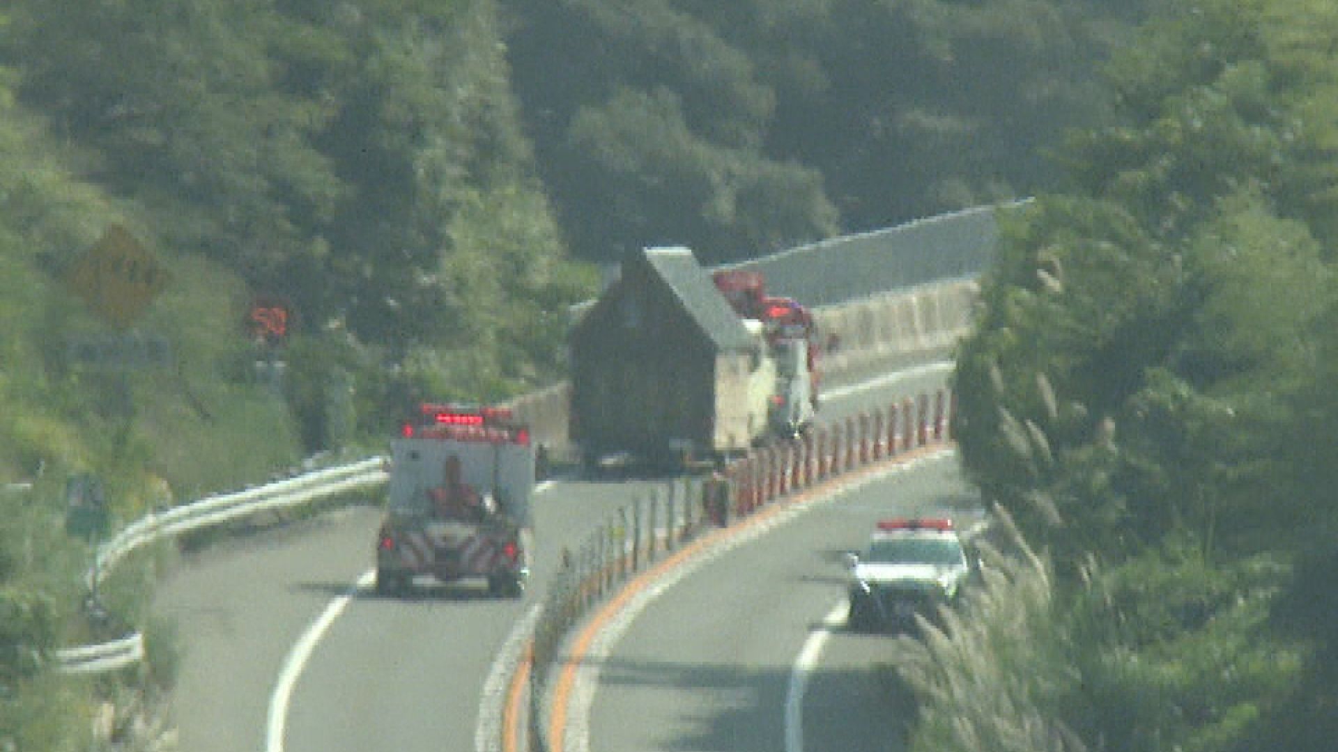 県警高速隊によりますと、この事故により松山自動車道が西予宇和ICと宇和島北ICの間で上下線が1時間あまりにわたって通行止めとなりましたが、ケガ人などはなかったということです。