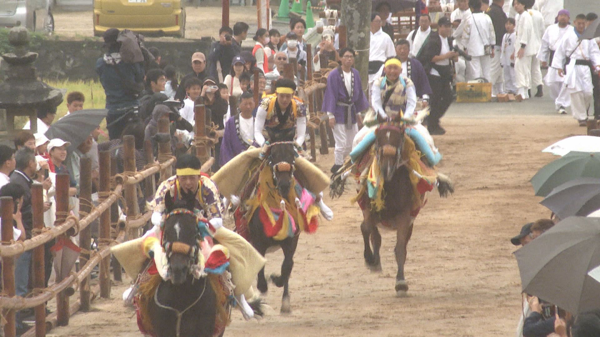 黄色いハチマキを頭に締めた「乗り子」と呼ばれる10歳から15歳までの子どもたちが、装飾の施された馬にまたがりおよそ300メートルの参道を駆け抜けました。