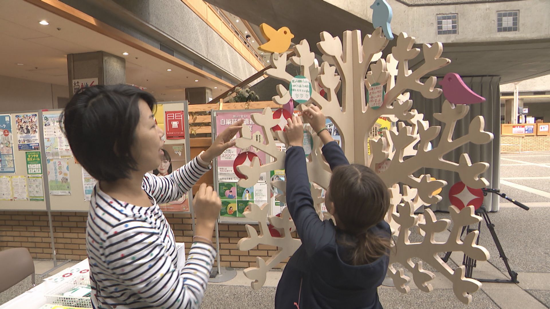 松山市総合コミュニティーセンターに24日登場したオブジェ「幸せになろう。の木」は、日々の暮らしの中で幸せと感じることをメッセージカードに書いて吊るしていくもので、訪れた市民が早速メッセージを書いていました。