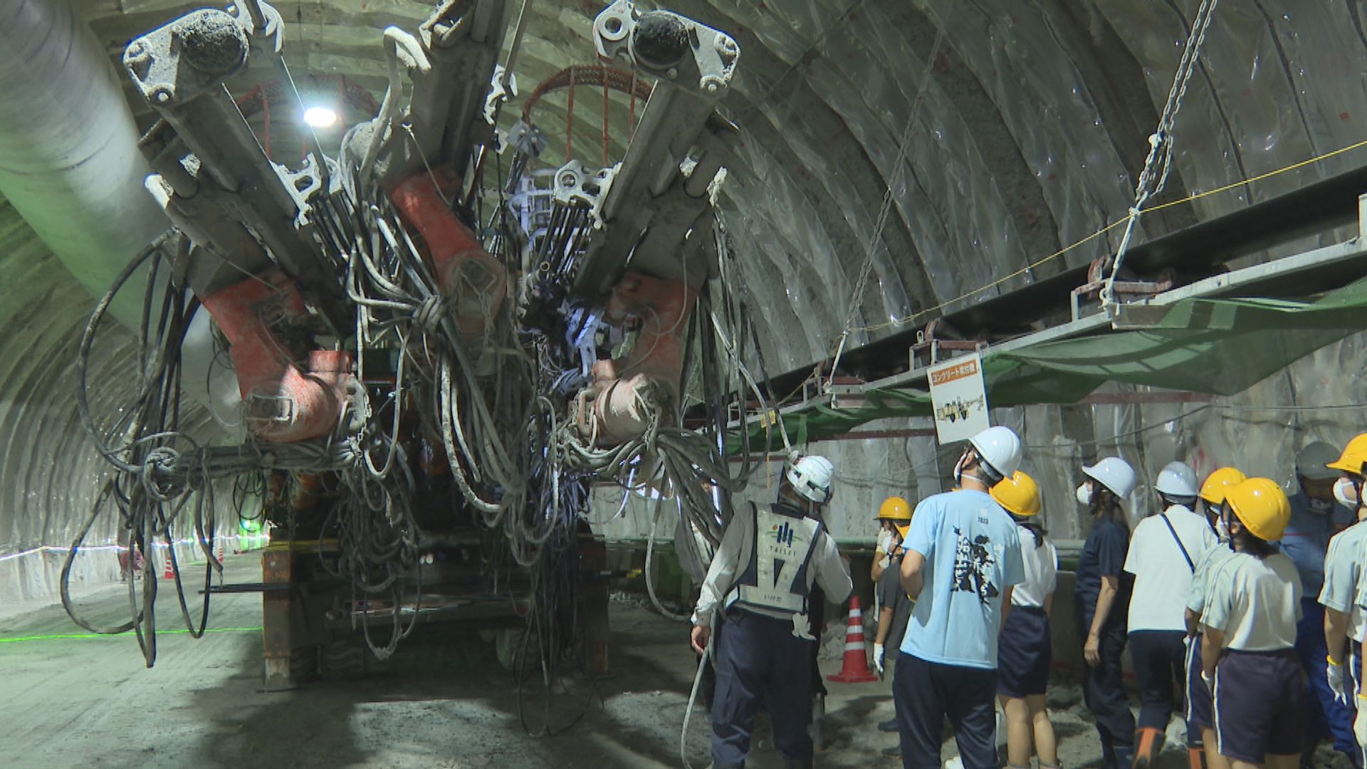 児童生徒らは、トンネルの掘削作業に使われる巨大な重機など、ふだん見ることができない建設工事の現場を見学し、改めて災害からの避難について考えていました。