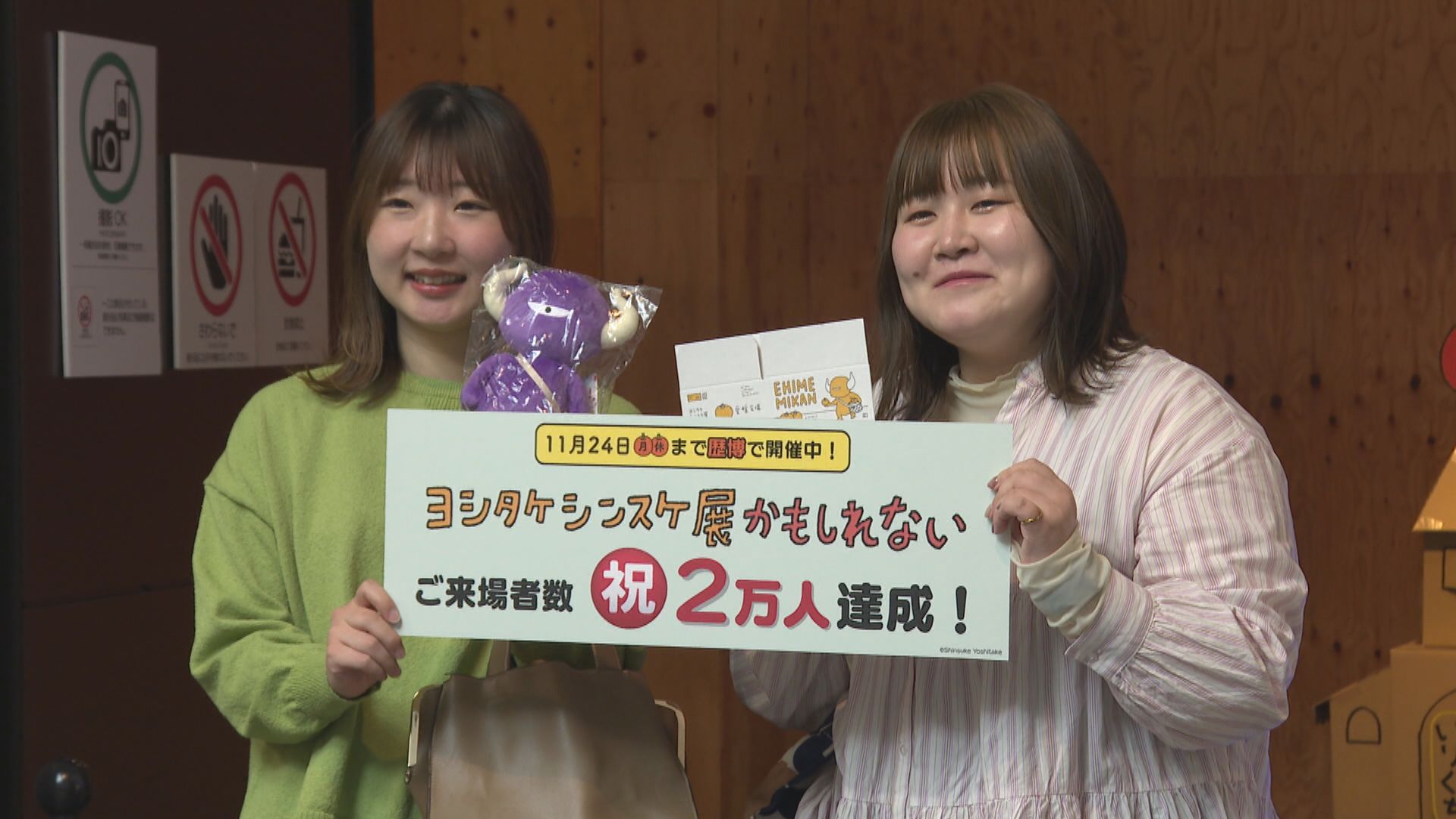 29日、来場者が2万人を突破し、八幡浜市在住の三好梨乃さんと西予市在住の山下安美さんの2人に、愛媛会場限定のオリジナルグッズ「みかん箱かもしれない」などが贈られました。
