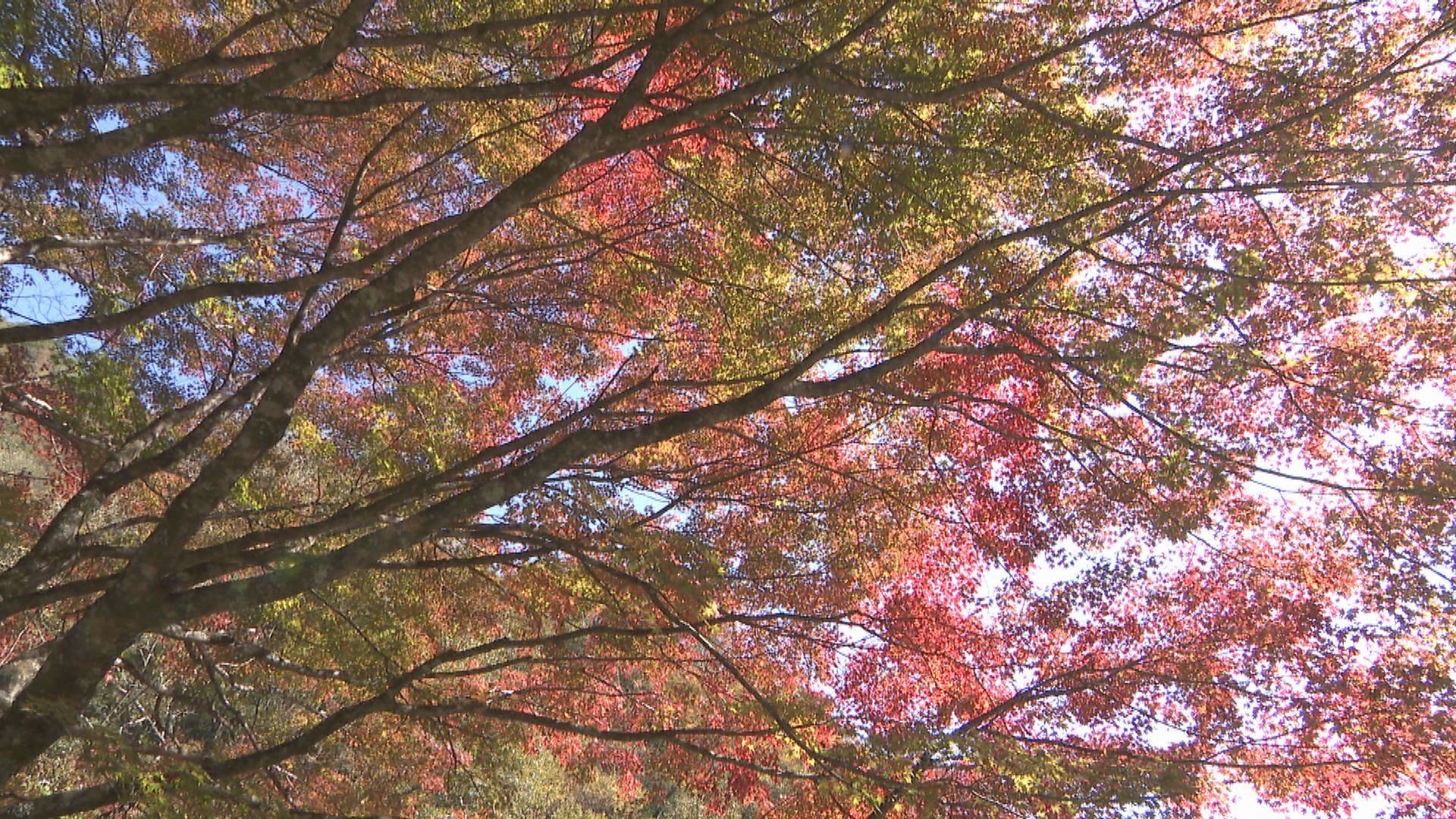 「午前11時過ぎの久万高原町内は日差しもあり過ごしやすく感じます。こんな秋らしい日に見たくなる紅葉ですが、赤く染まっているところもあるものの、緑がまだ少し目立ち、見ごろはもう少し先のようです」