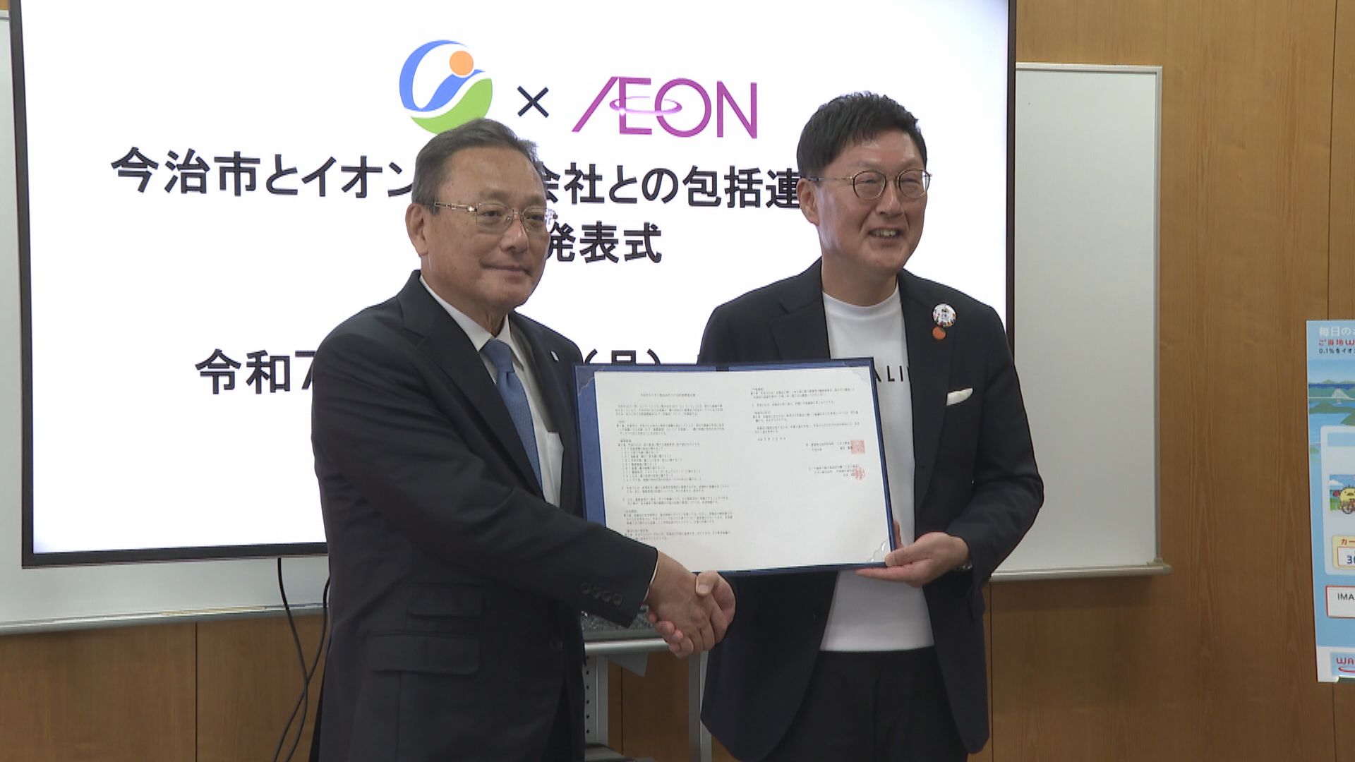 10日、今治市とイオンは子育て支援や防災対策、DXの推進など9つの項目で連携する包括連携協定を締結しました。