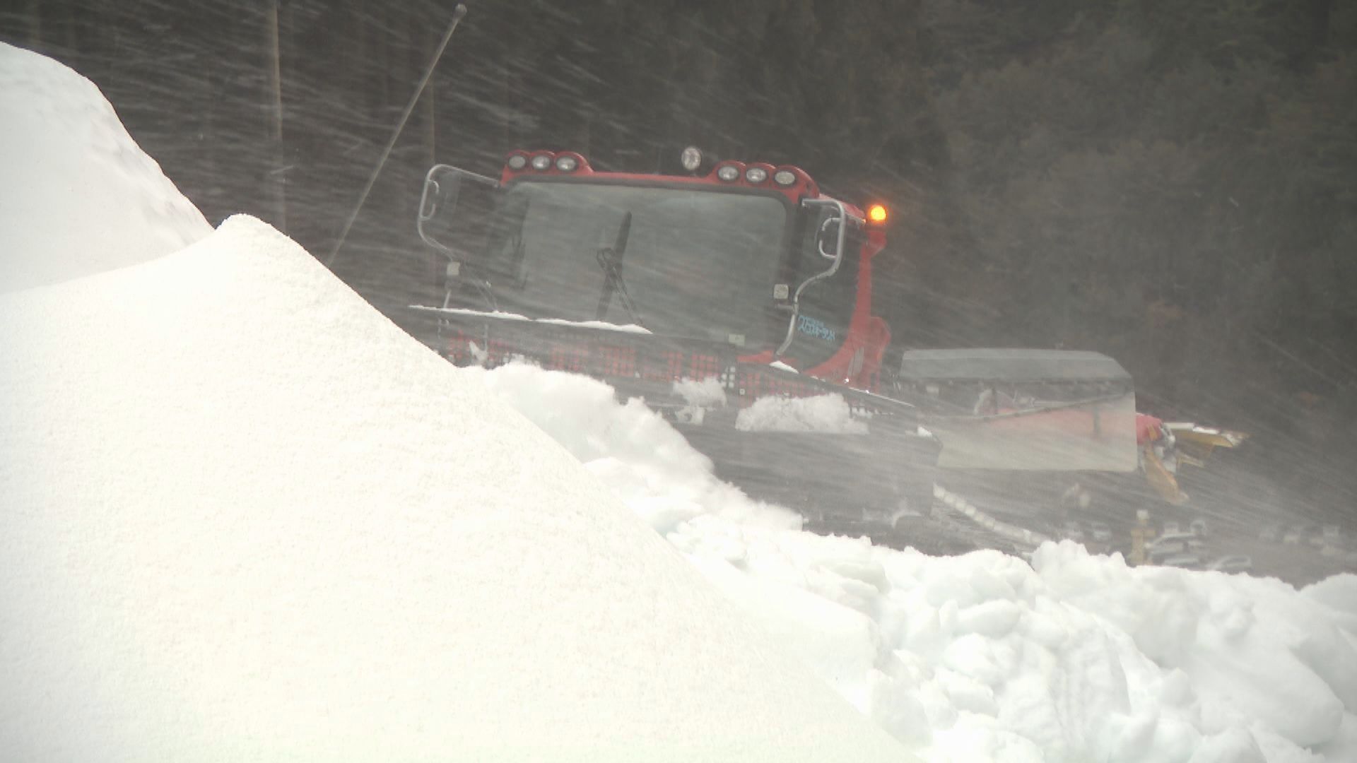 「こちら、大きな雪山ができています。今も天然雪がチラチラする中、こちらでは人工雪がどんどん降り積もっていきます」