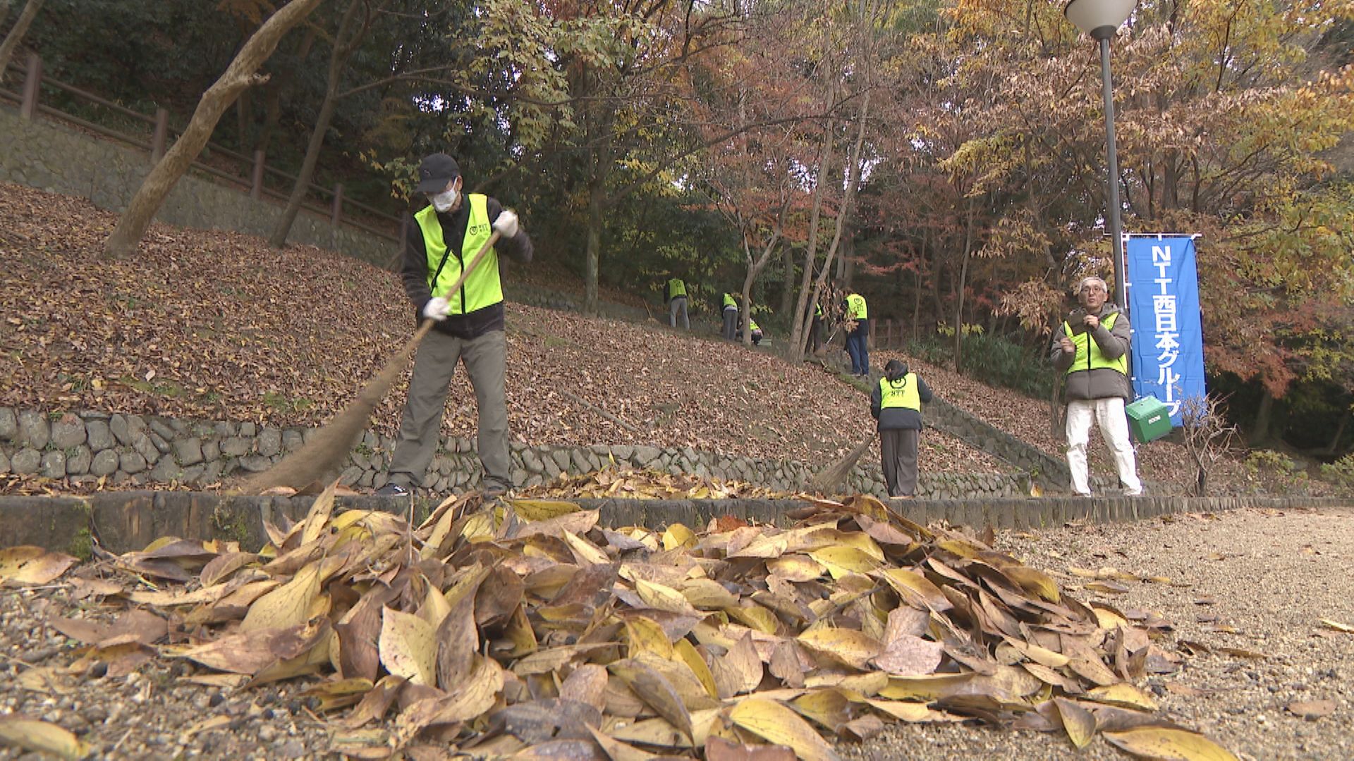 今年はグループ企業の社員などおよそ250人が参加し、火ばさみなどを使って公園内にたまった枯葉や落ちているゴミなどを集めました。
