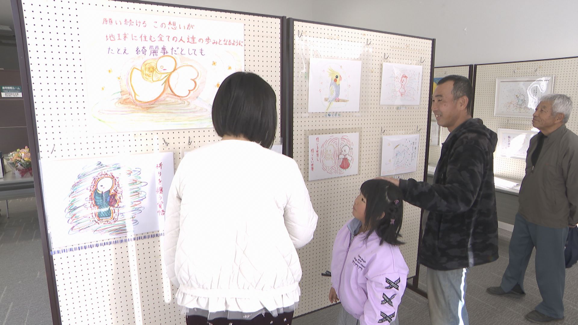 松山市にある伊予銀行森松支店で14日から始まった個展「ほっこりちゃんと平和の願い」