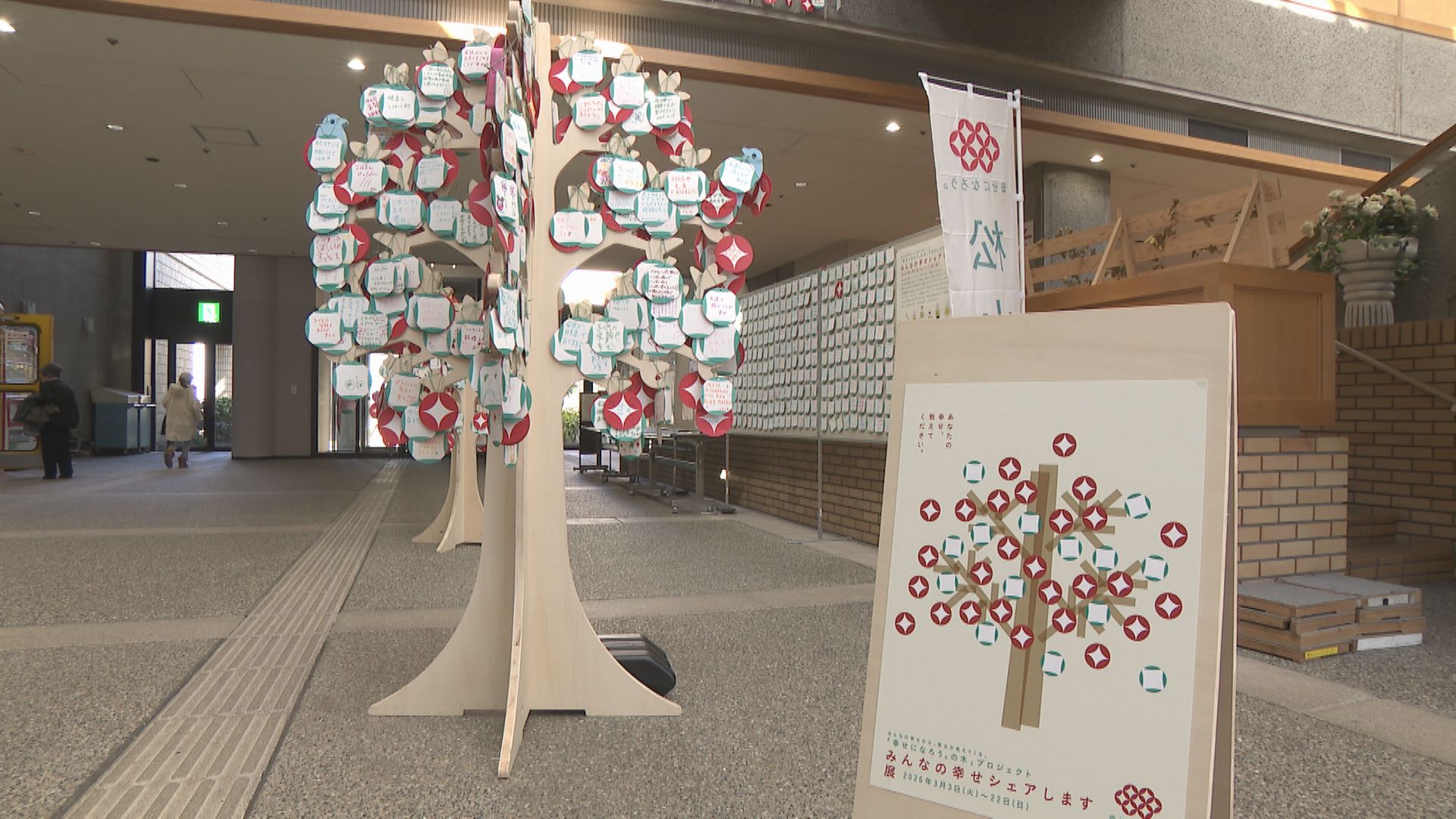 市のブランドスローガン「幸せになろう。」を、より知ってもらおうと行った参加型のアートプロジェクト「幸せになろう。の木」と、プロジェクトで集まった市民の幸せメッセージカード約3000枚が展示されています。