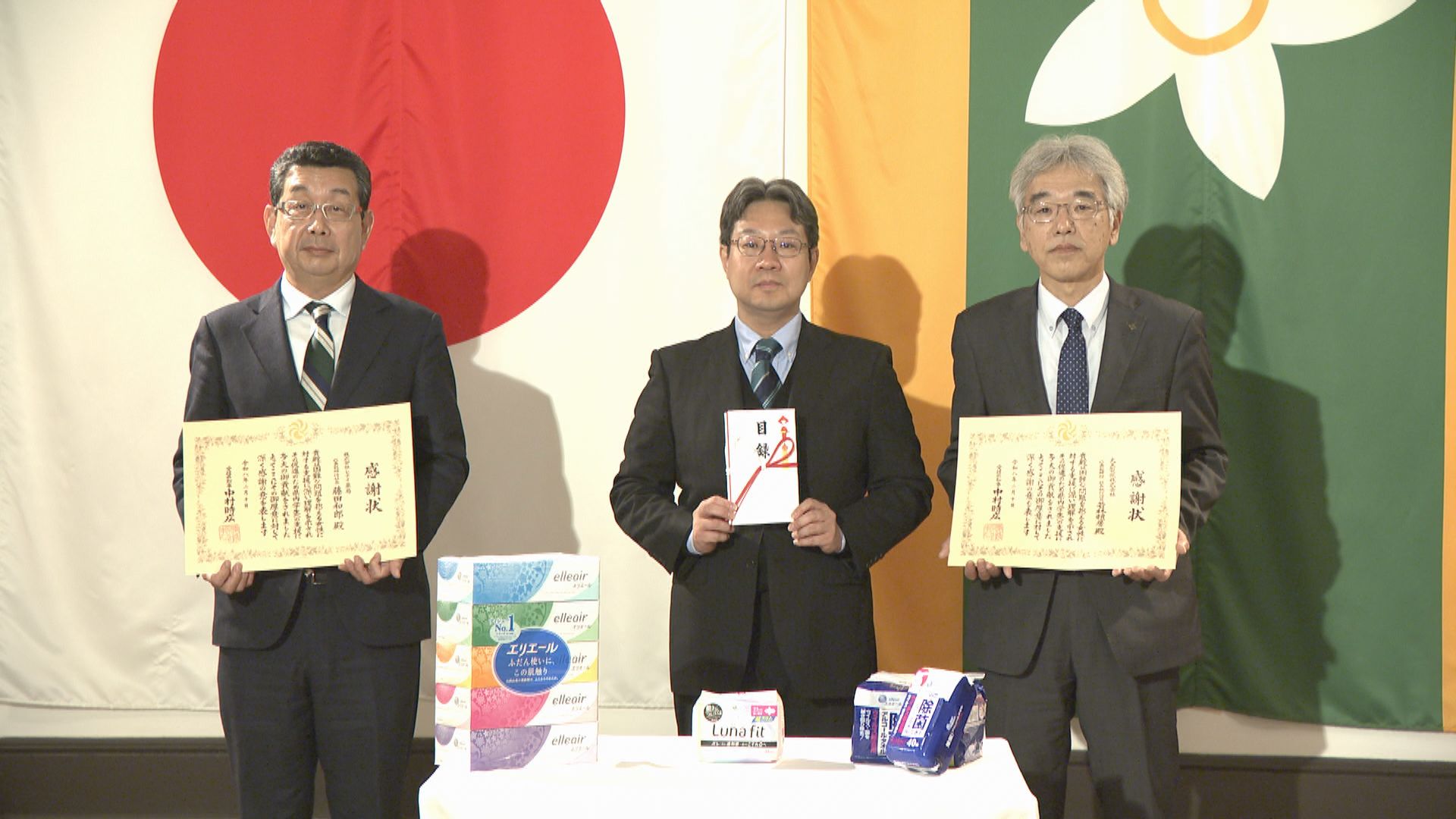 大手製紙メーカー・大王製紙はレデイ薬局とタッグを組み、ティッシュや生理用品などを10日、県に寄付しました。