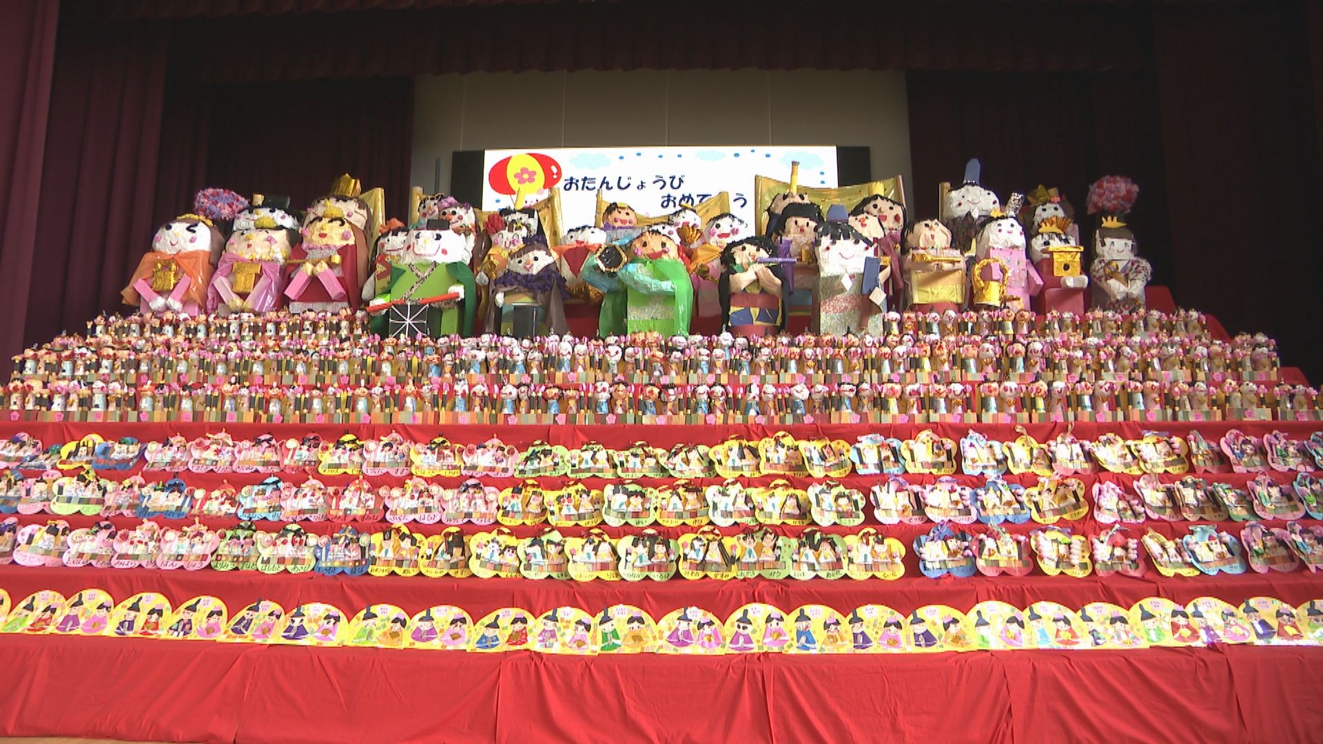 「こちらのステージには、子どもたちが作った個性豊かなひな人形がずらりと並べられています」