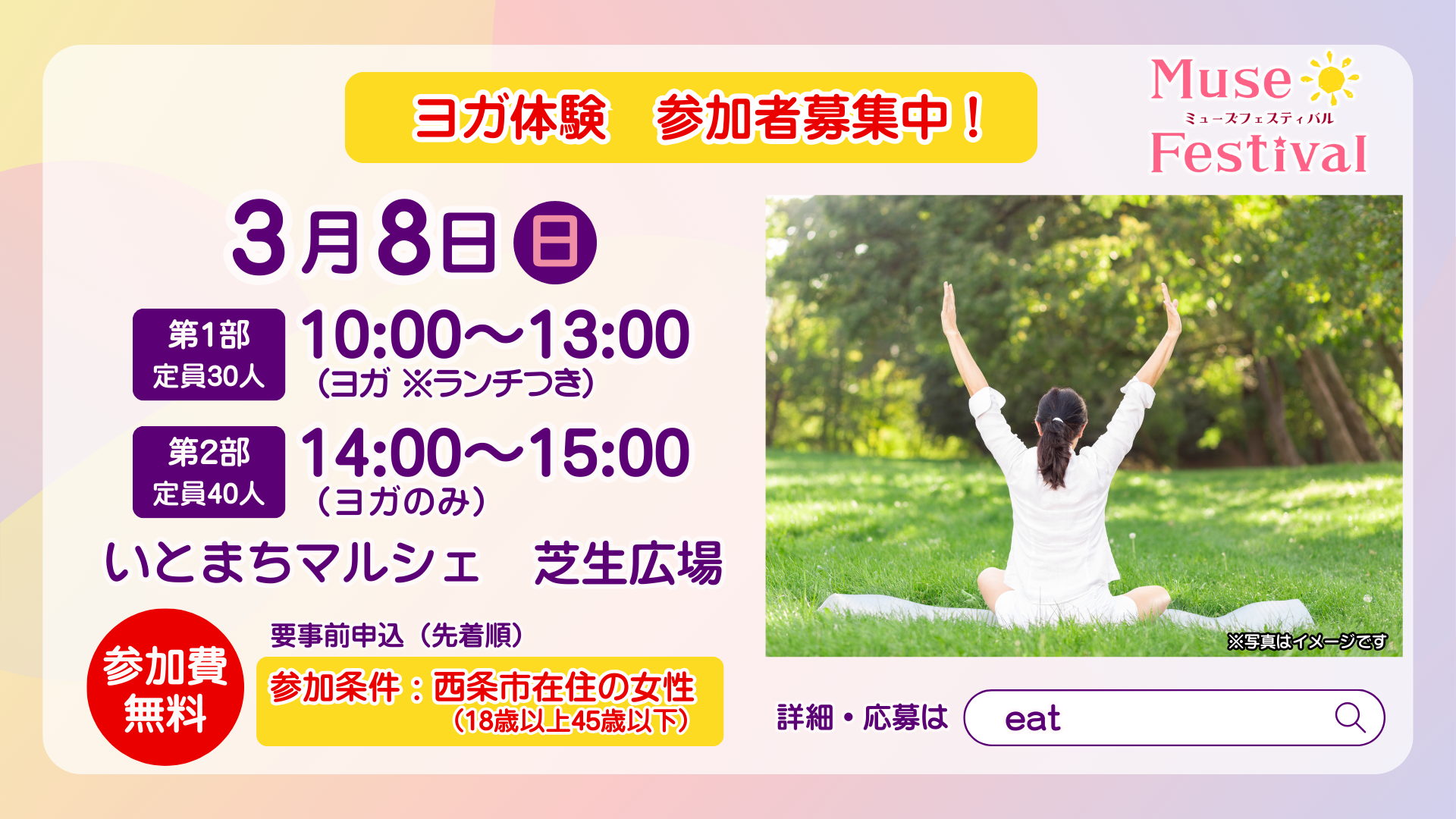 ミューズフェスティバル ~西条市 美と健康をみがく1日に~ 無料ヨガ体験会 参加者募集!【西条市在住の女性対象】