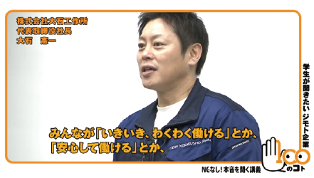 動画一覧 CMで放送した講義を一覧でご覧いただけます。気になった企業があれば、ぜひ未公開Q&Aもご覧ください! ジャスティン株式会社① あなたのステークホルダーは?篇 ジャスティン株式会社② その日のうちに篇 ジャスティン株式会社③ 男とか女とかじゃない篇 ジャスティン株式会社④ 適材適所とは?篇 ジャスティン株式会社⑤ ブレない会社の軸篇 朝日共販株式会社① なぜシラス?篇 朝日共販株式会社② MEL認証篇 朝日共販株式会社③ 海外展開篇 朝日共販株式会社④ 田舎のプライベート篇 マルトモ株式会社① コモディティをスペシャリティに篇 株式会社大石工作所① 女性の活躍できる仕事は?篇 株式会社大石工作所② 人づくり篇 株式会社大石工作所③ 女性社員はどんな仕事を?篇 株式会社大石工作所④ 「全員経営」篇 株式会社大石工作所⑤ 学生にしかできないことは?篇 共同計器株式会社① 平均年齢がわかいのはなぜ?篇 共同計器株式会社② 業界ナンバーワン篇 共同計器株式会社③ なんで一貫してできるんですか?篇 共同計器株式会社④ 県外・海外の可能性は?篇 共同計器株式会社⑤ 働きがい篇 オオノ開發株式会社① リチウムイオンバッテリー篇 オオノ開發株式会社② 会社で働く誇りは?篇1 オオノ開發株式会社③ 会社で働く誇りは?篇2 オオノ開發株式会社④ フレップ知多の展望は?篇 オオノ開發株式会社⑤ オオノ開發の差別化篇 企業別に講義を見る お問い合わせ CONTACT 参加をご希望の企業様は、こちらよりご質問・お問い合わせください メールでのお問い合わせ